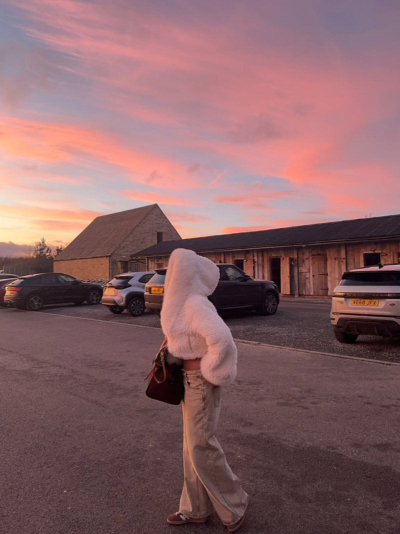 La fourrure synthétique épaisse et moelleuse garde la chaleur près du corps et procure une agréable sensation enveloppante — parfaite pour l’hiver et la mi-saison.